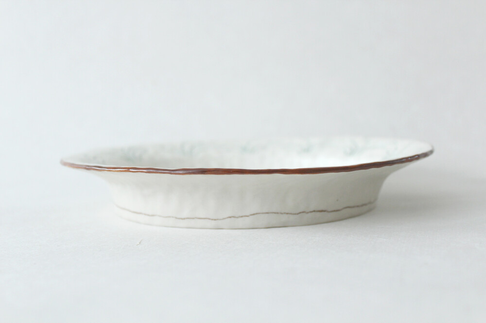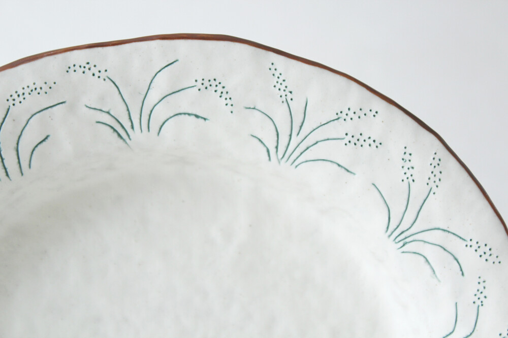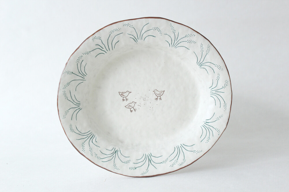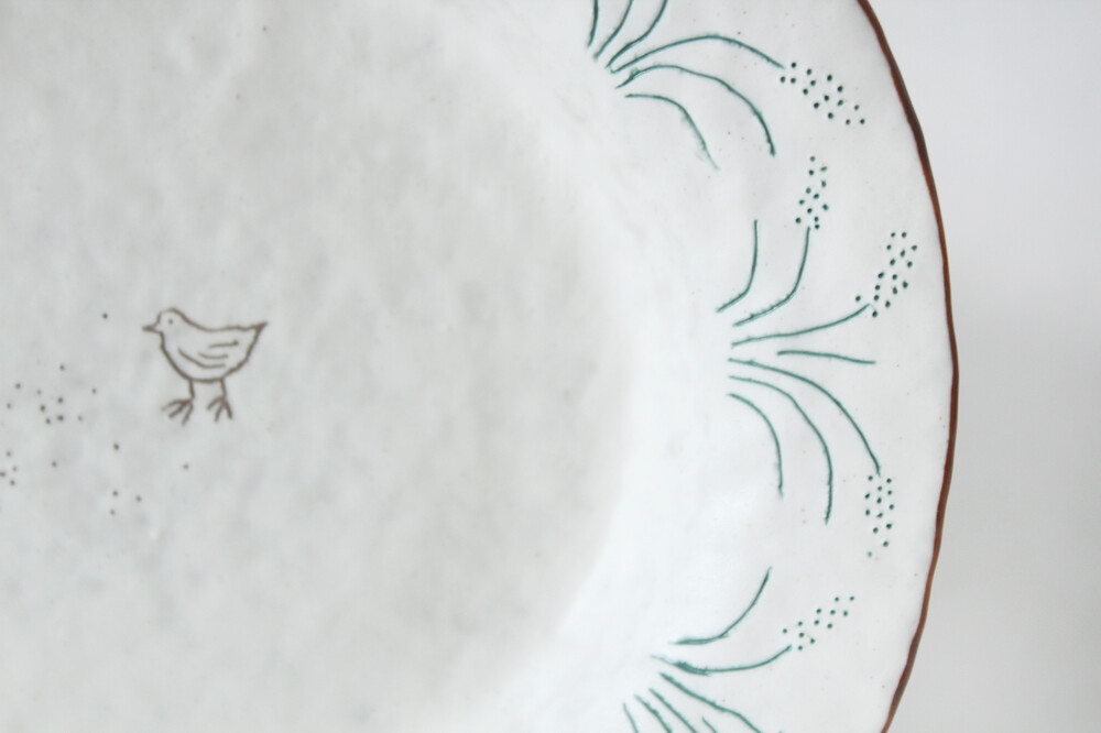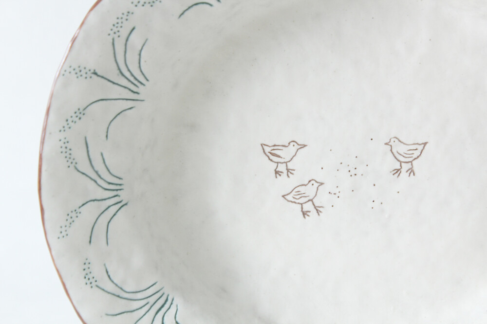 Summary : 꽤 큰 조각케잌 까지 거뜬하게 담기는 사이즈 입니다. 찐득한 초코 무스케잌이나 계란요리가 담겨져 있는 모습을 상상하며 제작했고, 강아지 풀들과 씨앗을 주워먹는 작은 새 3마리가 음각으로 새겨져 있습니다.