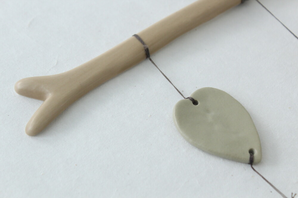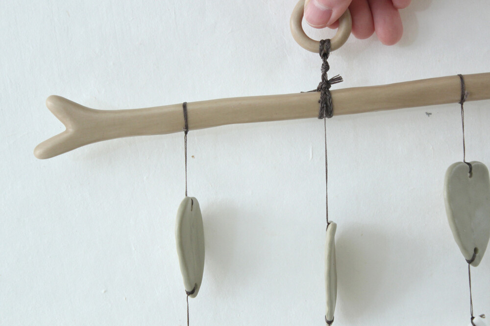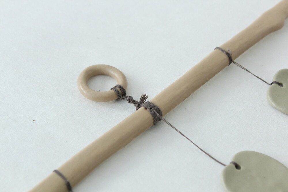 모빌 고리와 나뭇가지를 연결하는 실은 곱게 땋아 매듭지어 고정하였습니다
